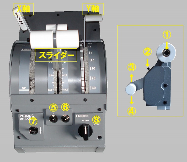 本機のリバーサーはデジタル式を採用しています。リバーサを上に引き上げるとエンジンがリバースになります。ボタン割り当てでリピート設定を行うので手前方向に引き上げている間リバースが掛かるようになっています。下方向に1回押し込むとアイドルパワーに戻ります。 |